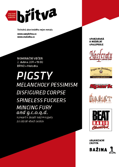 Nominační večer – 2.4.2011 – Brno, Melodka – PIGSTY, MELANCHOLY PESSIMISM, DISFIGURED CORPSE, MINCING FURY…, SPINELESS FUCKERS
