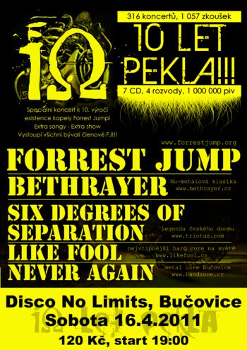 Letošní jaro je dobou, kdy se kapela FORREST JUMP prokousala k 10. Výročí existence. Proto Vás zveme 16.4.2011 do bučovického klubu No Limits na výroční koncert, kterého se kromě FORREST JUMP zúčastní také SiX DEGREES OF SEPARATION, BETHRAYER, LIKE FOOL a NEVER AGAIN.